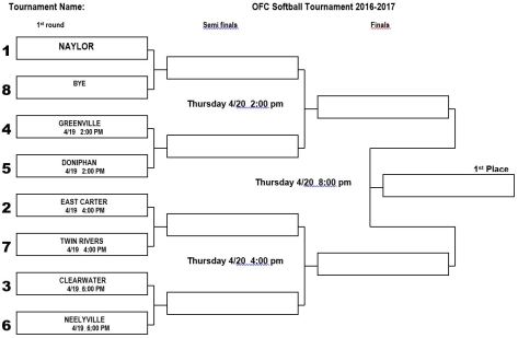 3rd Place OFC Softball Tournament Game (Clearwater vs Doniphan) will be played at 4:00 pm on Wednesday, April 26.