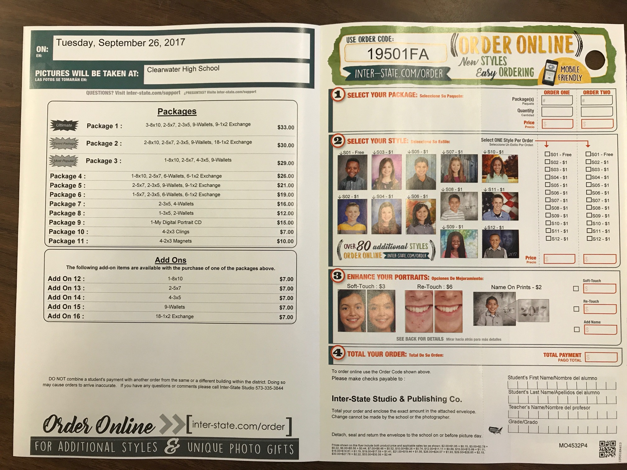 The school photographer will be coming on Tuesday, September 26 to take photos at all Clearwater campuses. Flyers with tear-off envelopes were distributed at school to send money for pictures. If you prefer to order online, please use the following codes: