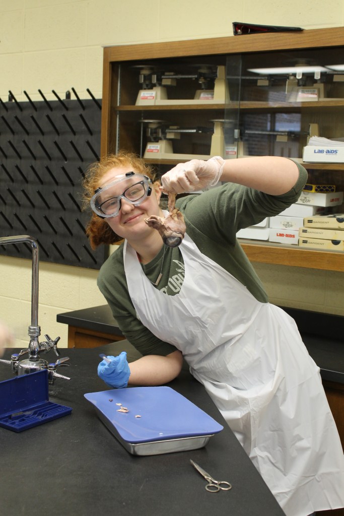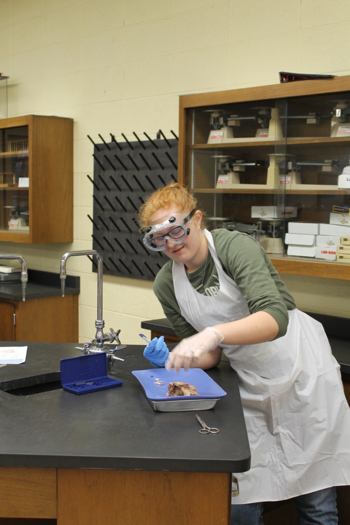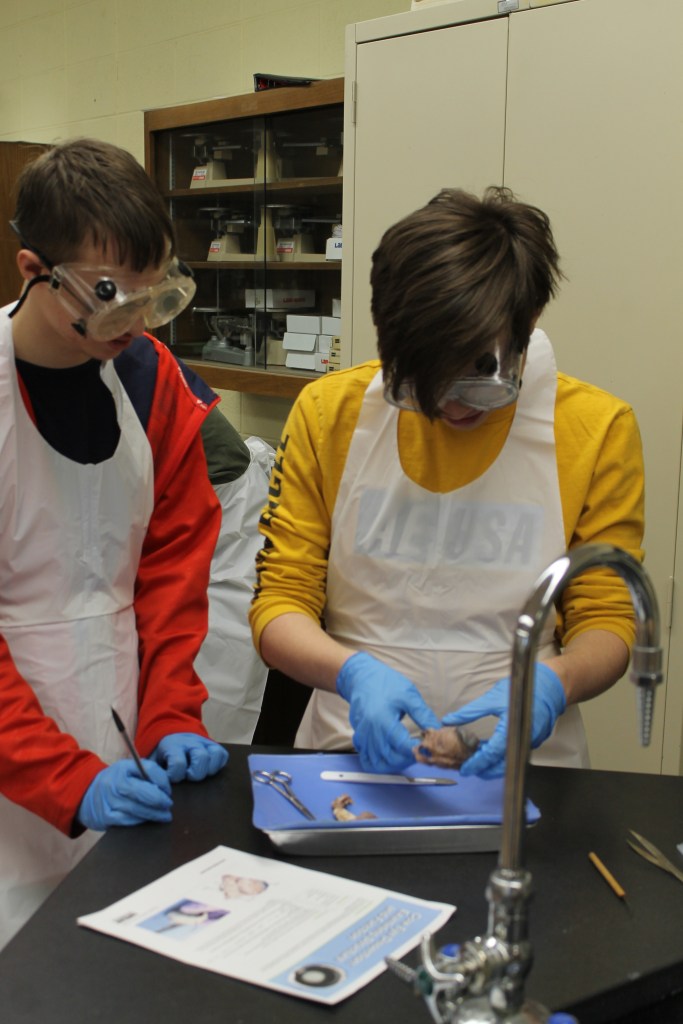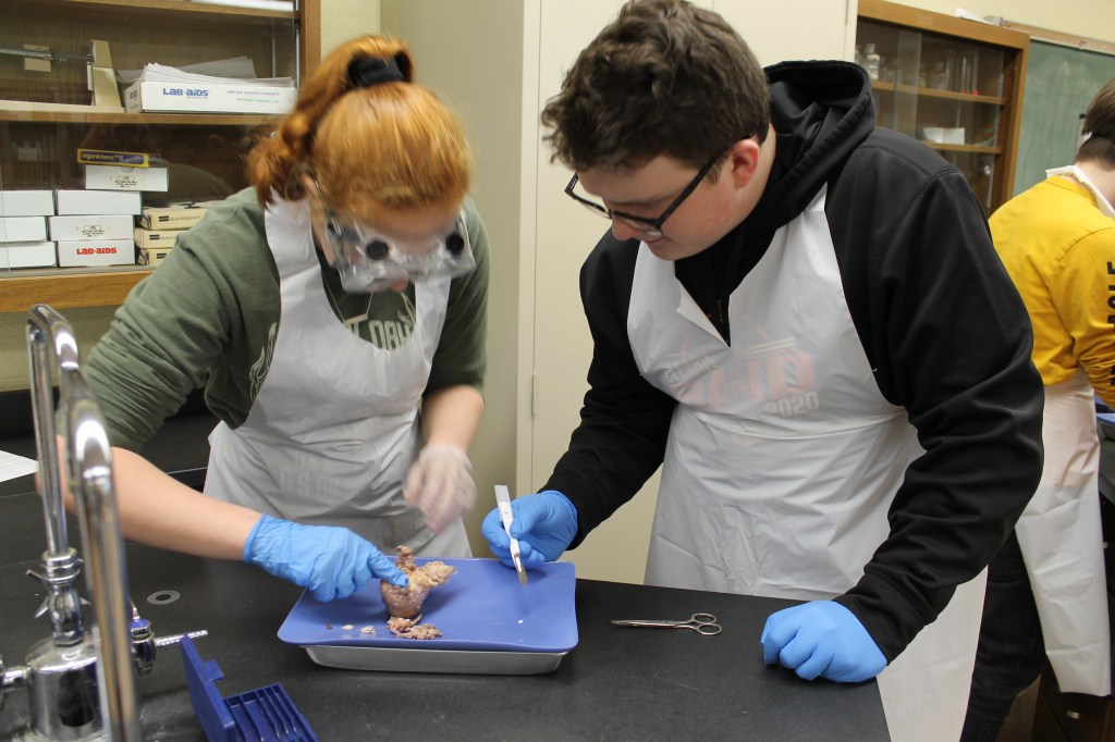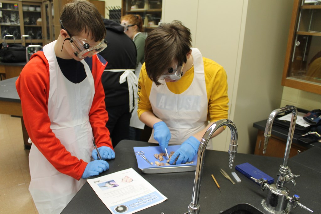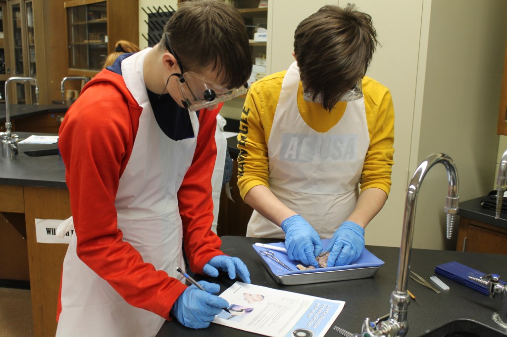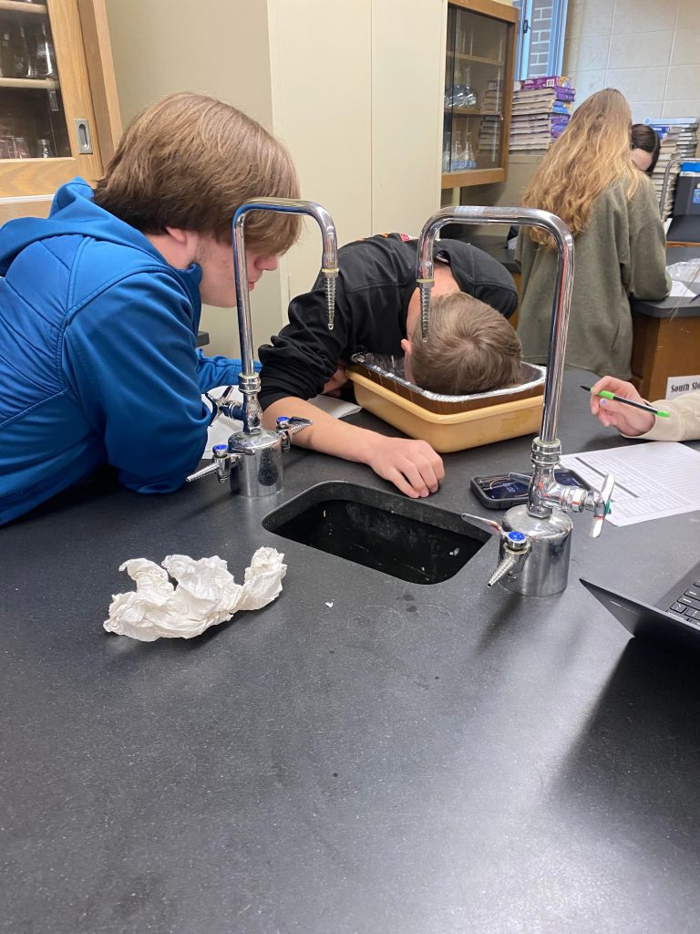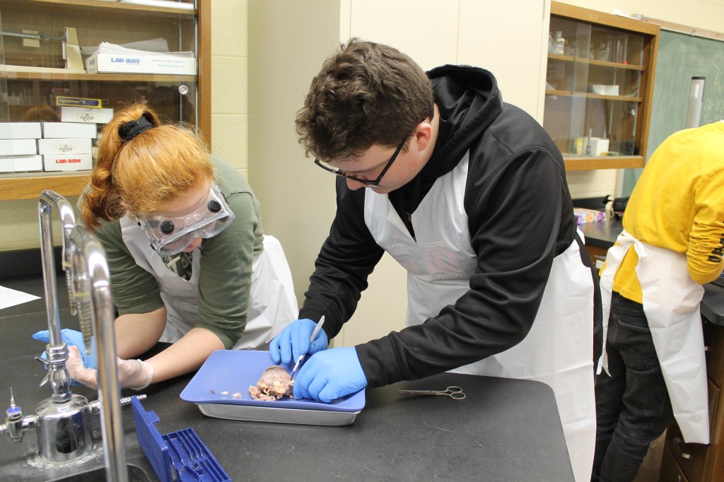 Mrs. Martin’s Anatomy Class is learning about the eyeball sensory system and dissecting cow eyes. (Pictures by Kloe L’Heureux) And in Biology, students participated in a Mammalian Dive Response Lab.